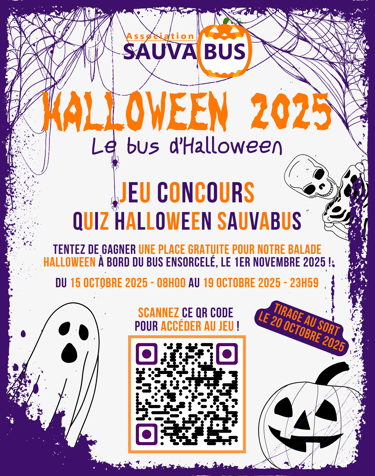🚌 Répondez à notre Quiz Halloween Sauvabus et tentez de gagner 1 place gratuite pour l’événement du samedi 1er novembre 2025.