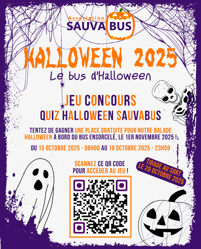 🚌 Répondez à notre Quiz Halloween Sauvabus et tentez de gagner 1 place gratuite pour l’événement du samedi 1er novembre 2025.